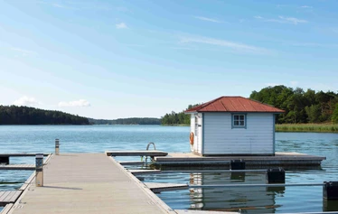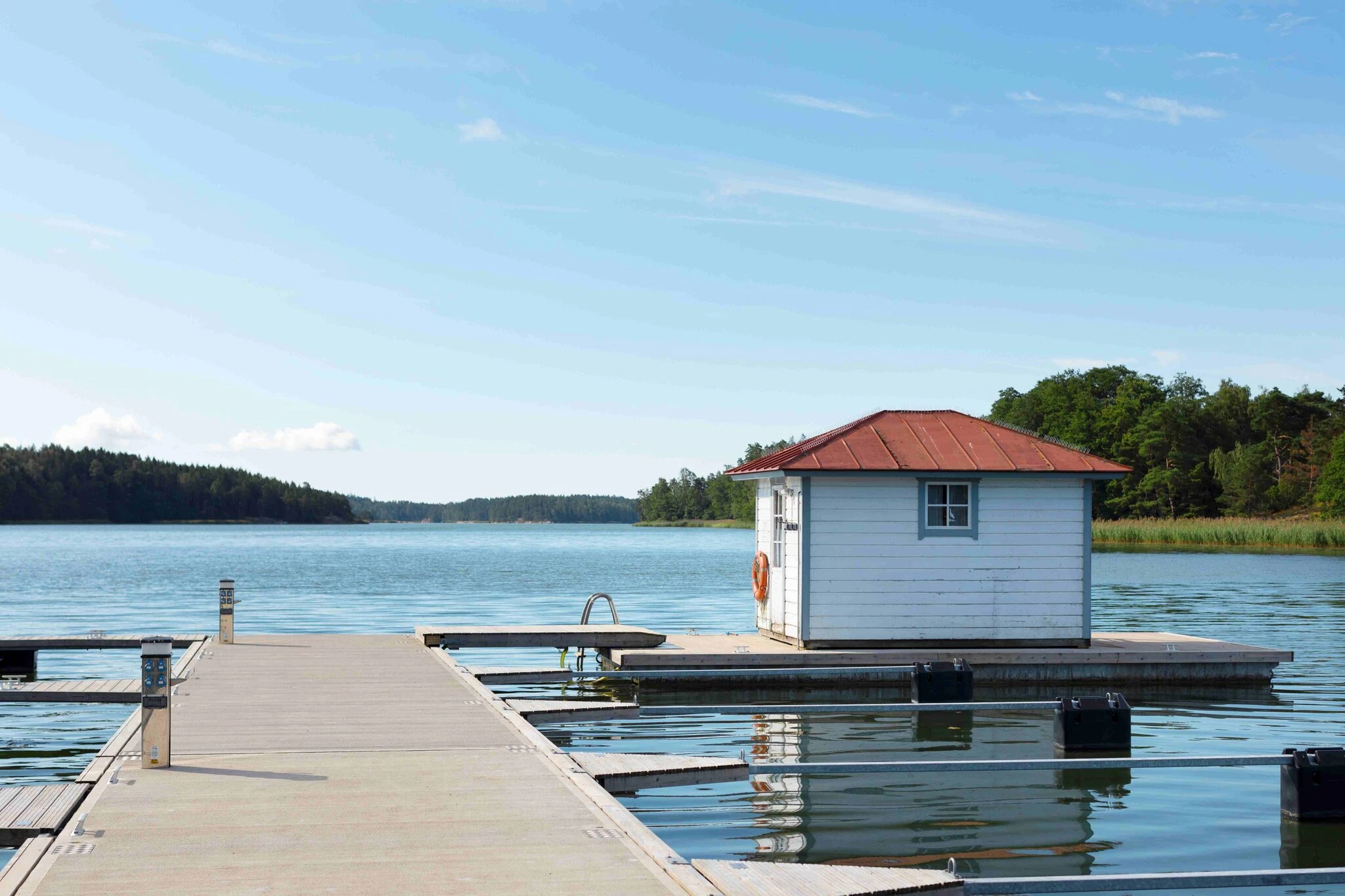 Laituri sijaitsee kartanon rannassa. Kulje kartanolta johtavaa hiekkatietä suoraan rantaan – matkaa on noin 200 metriä. Saavut perille kartanon vierasvenelaiturille.